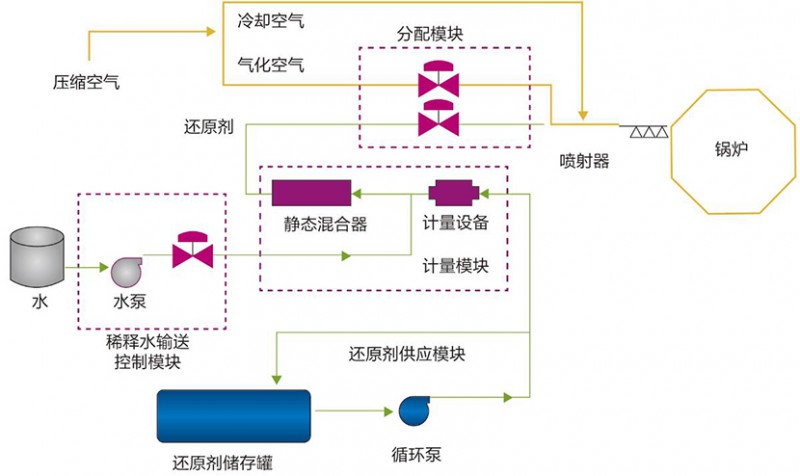 選擇性非催化還原法(Selective Non-Catalytic Reduction,簡(jiǎn)稱SNCR),是在不需要催化劑的情況下,將氨基還原劑(尿素/氨水)噴入溫度為850~1150℃的煙氣中,還原劑有選擇性地與煙氣中的氮氧化物發(fā)生化學(xué)反應(yīng),使NOx還原生成N2和H2O的方法。